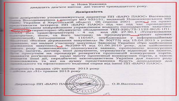 2. Обидва Учасники надали довіреності представляти інтереси підприємств з ідентичними за формою та змістом текстами, при цьому мають місце однакові граматичні помилки у вигляді пробілів, які не встановлено загальноприйнятими правилам, а саме: «( паспорт»; «року )»; «процедурою «запит»; «закупівель »». Крім цього, обидва Учасники в торгах по закупівлі електричного обладнання в довіреності пишуть слово «продуктів» .