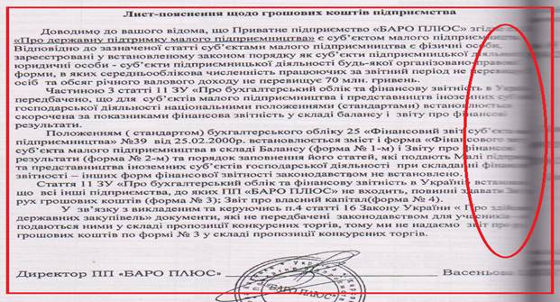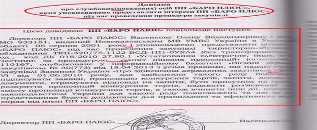 За інформацією ПП «БАРО ПЛЮС», наданою листом від 14.08.2015 №1408-15 на вимогу Відділення від 28.07.2015 №2-47/508, для підготовки документів пропозиції конкурсних торгів для участі в Торгах, не залучало третіх осіб, вся документація готувалась директором Васеньовою Оленою Володимирівною з використанням індивідуального, творчого підходу з врахуванням ринкової ситуації на ринку.