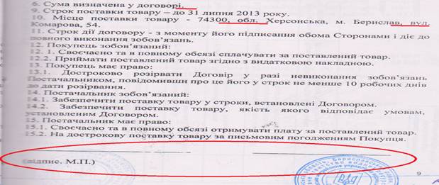 Учасниками подано вищезазначений додаток 3 з однаковим оформленням пунктів 6 та 10 документу із однаковими нетиповими помилками, а саме: відсутність пробілу між попереднім словом та наступним («договорі-»; «74300,обл.»; «Берислав,вул.Комарова»). Крім того, обидва Учасники залишили місце підпису, місце печатки та місце для розшифрування, прізвища, ім’я, по-батькові підписанта не заповненими та додали до форми «Основні умови договору» назви посад, хто підписав цю форму, прізвища, та ініціали підписантів та скріпили печатками своїх підприємств.