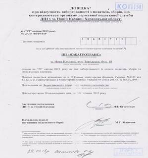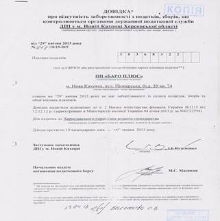 6. Замовником в ДКТ передбачено надання ряду документів з Державної податкової служби України, а саме: копія довідки про взяття на облік платника податку (у наявності) та копія свідоцтва про реєстрацію платником податку на додану вартість або свідоцтва про право сплати єдиного податку в розмірі 10% (у наявності). Однак, крім вказаних копій довідок та свідоцтв, обидва Учасника подали ще один документ - «Довідка про відсутність заборгованості з податків, зборів, що контролюються органами державної податкової служби», виданий ДПІ у м. Новій Каховці Херсонської області. При цьому довідки мають одну дату реєстрації, послідовні номери реєстрації (ПП «БАРО ПЛЮС» від 29.04.2013 № 3258/10/19-019 та ПП «ЮЖАГРОТРАНС» від 29.04.2013 №3259/10-19-019) та отримані в ДПІ в один день 29.04.2013 року, однією й тією ж людиною - Васеньовою О.В., яка є засновником та керівником ПП «БАРО ПЛЮС».