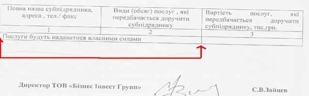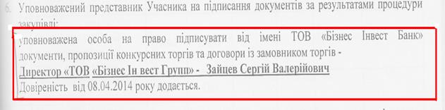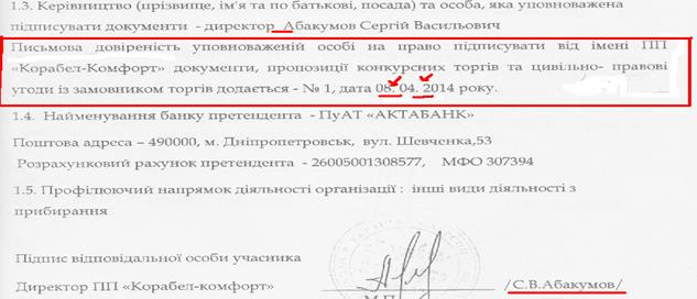 Так, окрім того, що у тексті «Форми пропозиції конкурсних торгів», наданих Учасниками у складі ПКТ, виявлені схожі ознаки оформлення текстової інформації. А саме, п. 6 Форми «Пропозиція конкурсних торгів» передбачає внесення Учасниками відомостей про уповноваженого представника на підписання документів за результатами процедури закупівлі і, якщо інші учасники Процедури закупівлі у цьому пункті вказали фактично лише посаду та прізвище ім`я по-батькові своїх представників, то ПП «Корабел-Комфорт» та ТОВ «Бізнес Інвест Групп» надали на цей пункт розширену інформацію, ідентичну за змістом між Учасниками.