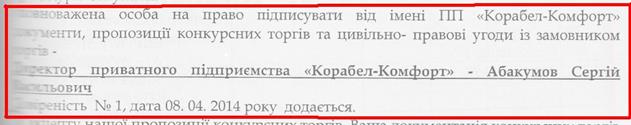За інформацією ПП «Корабел-Комфорт» від 05.09.2014 № 44, наданою на вимогу територіального відділення від 28.08.2014 №2-37/804, під час проведення процедури закупівлі Суб’єктом господарювання не використовувались шаблони документів, таблиці тощо, крім тих, що зазначені в тендерній документації замовника. Для підготовки тендерної пропозиції Суб’єктом господарювання треті особи не залучалися. Для підготовки тендерної пропозиції Суб’єктом господарювання використовував накопичений, напрацьований досвід відповідно до вимог документації замовника.