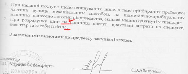Окрім того, документи «Калькуляція» обох Учасників у своїй назві містять спільну граматичну помилку, а саме словосполучення «підмітально-прибиральною», всупереч встановлених правил орфографії української мови, виконане Учасниками наступним чином: «підметально-прибиральною», хоча у тексті інших документів, наданих Учасниками у складі ПКТ, зазначене словосполучення виконане із дотриманням загальноприйнятих орфографічних норм.