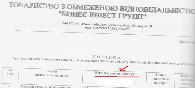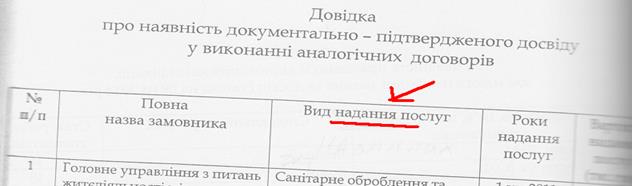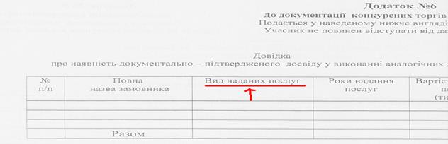 8. Пунктом 3.1 ДКТ передбачено, що ПКТ Учасників мають містити у своєму складі довідку про наявність документально-підтвердженого досвіду у виконанні аналогічних договорів встановленої форми згідно з додатком № 6. Зразок зазначеного документа виконаний у табличній формі. Так, надані Учасниками у складі ПКТ вказані довідки виконані у повній ідентичності зі зразками, однак при цьому, всупереч встановленій формі, Учасники назвали один з стовпчиків таблиці «Вид надання послуг», хоча ДКТ передбачена інша назва, а саме «Вид наданих послуг», що візуально має такий вигляд: