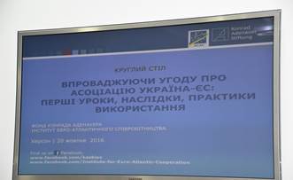 20 жовтня Голова Херсонського обласного територіального відділення Антимонопольного комітету України Вячеслав Василенко прийняв участь у засіданні «круглого» столу на тему: «Впроваджуючи Угоду про асоціацію Україна – ЄС: перші кроки, наслідки, практики використання» за організації Представництва Фонду Конрада Аденауера в Україні, Інституту Євро – Атлантичного Співробітництва та за участю голови ОДА Андрія Гордєєва, представників Інституту економічних досліджень і політичних консультацій, громадськості, бізнесу області.