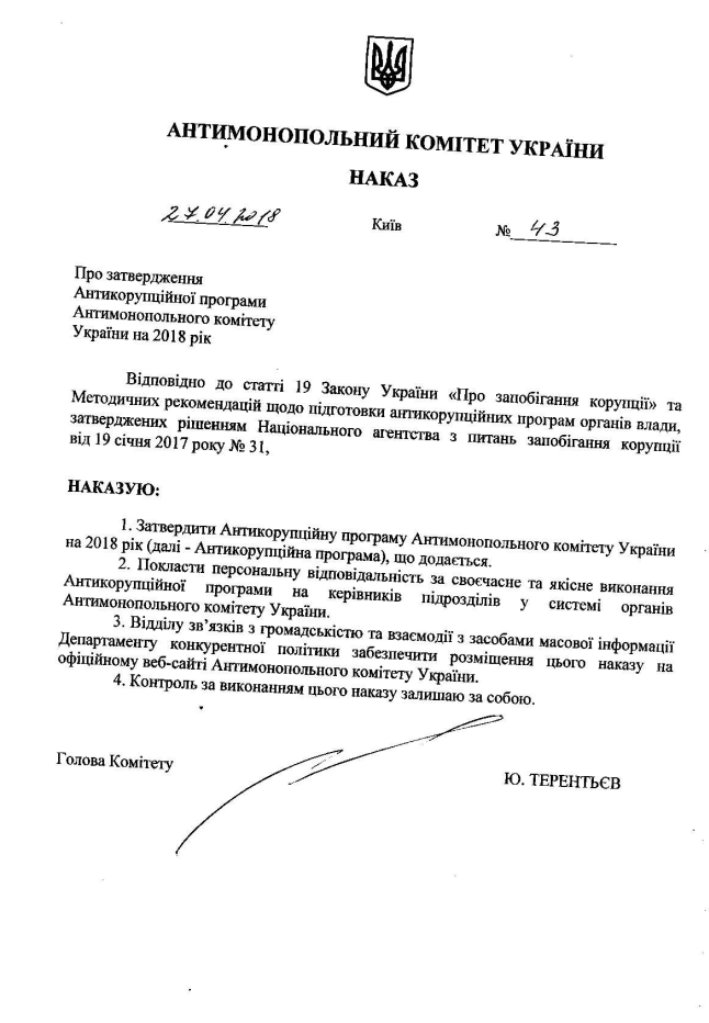Антикорупційна програма Антимонопольного комітету України на 2018 рік (далі - Антикорупційна програма) розроблена на виконання статті 19 Закону України «Про запобігання корупції» (далі - Закон) та вимог Методології оцінювання корупційних ризиків у діяльності органів влади, затвердженої рішенням Національного агентства з питань запобігання корупції від 02 грудня 2016 року № 126, зареєстрованим в Міністерстві юстиції України 28 грудня 2016 року за № 1718/29848, та з урахуванням Методичних рекомендацій щодо розробки антикорупційних програм органів влади, затверджених рішенням Національного агентства з питань запобігання корупції від 19 січня 2017 року № 31.