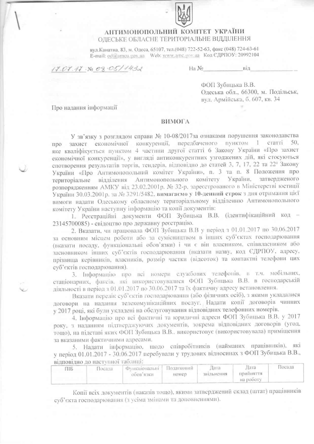 Вимога від 01.11.2017 №08-05/2282 про надання інформації ФОП Делайчук А.В.