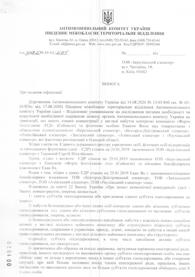 Вимога від 31.08.2020 №65-02/2066 ТОВ "Аліягський елеватор"