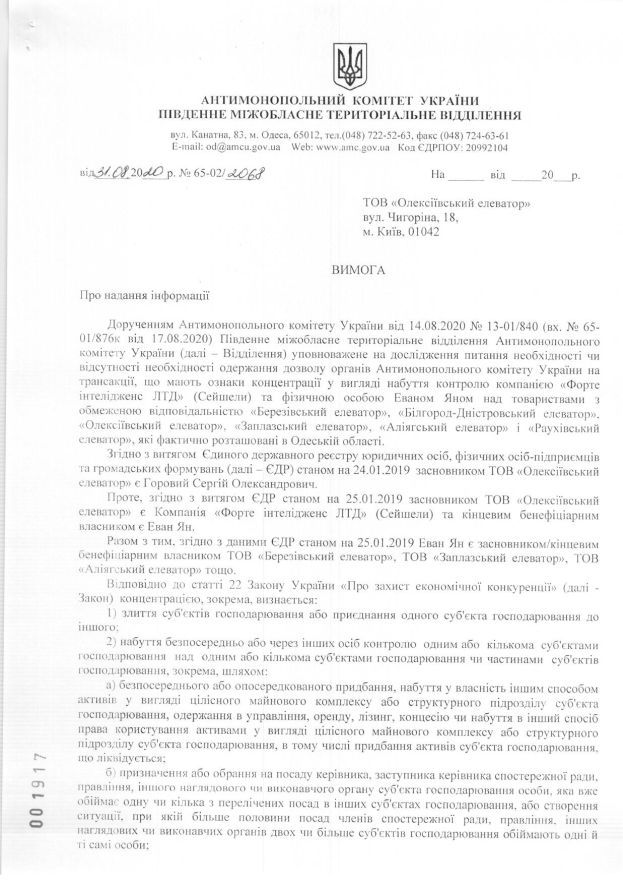 Вимога від 31.08.2020 №65-02/2069 ТОВ "Раухівський елеватор"