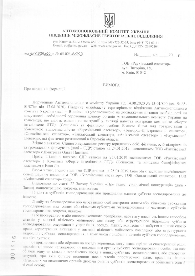 Вимога від 31.08.2020 №65-02/2068 ТОВ "Олексіївський елеватор"