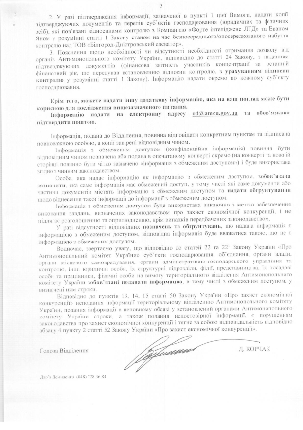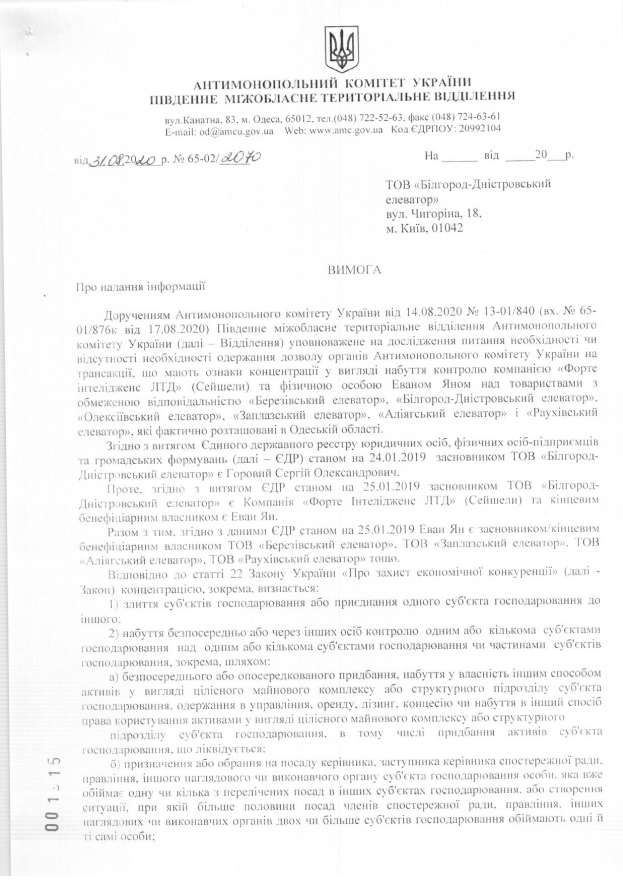 Вимога від 31.08.2020 №65-02/2070 ТОВ "Білгород-Дністровський елеватор"